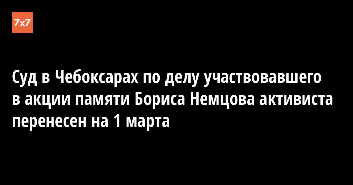 Как сообщил корреспонденту «7x7» правозащитник Алексей Глухов, который представляет интересы обвиняемого, заседание перенесено по ходатайству защиты, чтобы та могла ознакомиться с материалами дела. Полицейские обвиняют активиста Андрея Фёдорова по статье 20.2 Кодекса об административных правонарушениях («Нарушение установленного порядка организации либо проведения собрания, митинга, демонстрации, шествия или пикетирования»). Следующее заседание назначено на 10:30 1 марта в Ленинском районном суде Чебоксар.