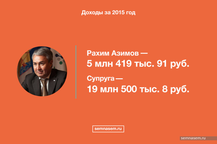Депутат Госдумы Рахим Азимов, по данным на сайте Законодательного собрания Кировской области, за 2015 год заработал 5 млн 419 тыс. 91 руб. Информации о его доходах за предыдущие годы нет: Азимов не работал на должностях, которые обязывали бы его публиковать сведения об этом. В 2016 году он, выдвигаясь кандидатом в Госдуму, подавал декларацию о доходах, в которой отразил чуть меньшую сумму — 5 млн 200 тыс. руб. Его супруга Елена за 2015 год получила гораздо больший доход — 19 млн 500 тыс. руб.