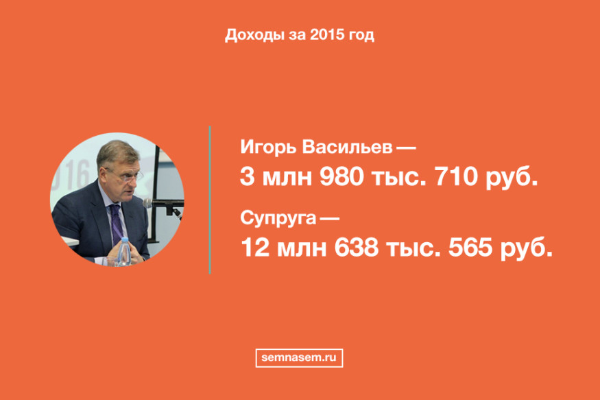 Если предположить, что супруга Игоря Васильева работает в МГИМО и это единственный источник ее доходов, то она в 2015 году зарабатывала по 1 млн руб. в месяц. Для сравнения: ректор МГИМО Анатолий Торкунов за 2015 год задекларировал доход в 24,4 млн руб.