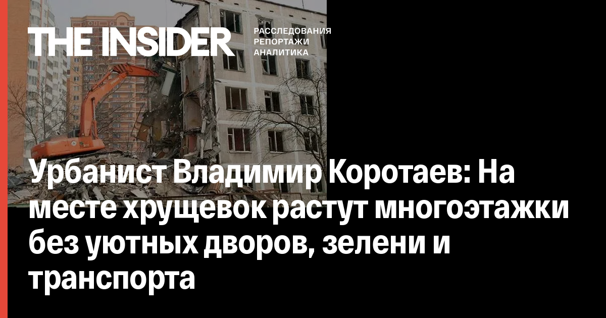 Вчера глава Минстроя Михаил Мень заявил, что в ближайшее время министерство совместно с правительством Москвы может внести в Думу законопроект, который упростит массовый снос хрущевок. Новая программа по ликвидации пятиэтажек в Москве предполагает снос еще около 8 тысяч домов. Снести пятиэтажки ранее поручил Собянину Путин. Директор Центрального научно-исследовательского и проектного института по градостроительству Владимир Коротаев в интервью The Insider рассказал, почему от сноса пятиэтажек пострадают главным образом москвичи.