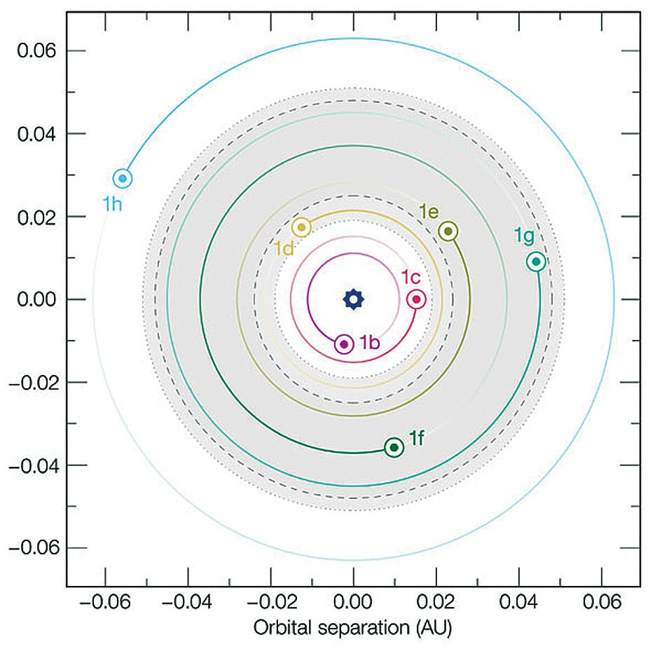 К обитаемой зоне относят планеты e, f, g, хотя с первого взгляда планета d по интенсивности обогрева подходит больше, чем g. Тут требуется довольно сложная дискуссия с оценками возможного парникового эффекта, включающая массу неопределенностей. Конечно, понятие обитаемой зоны очень условно.