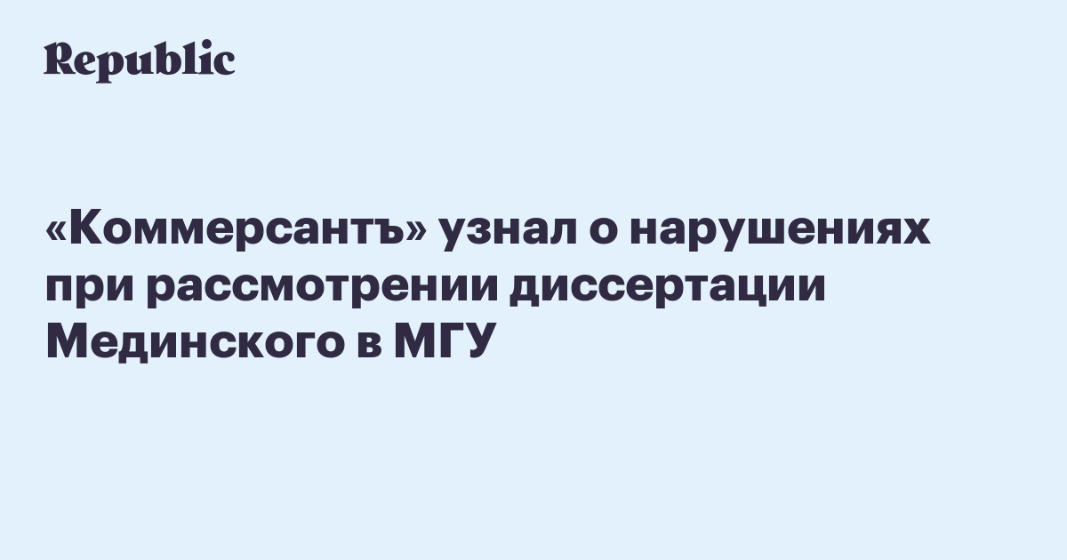 Диссертационный совет при историческом факультете МГУ допустил многочисленные нарушения при рассмотрении научной работы министра культуры Владимира Мединского в начале февраля 2017 года. Об этом в номере от 1 марта пишет газета «Коммерсантъ».