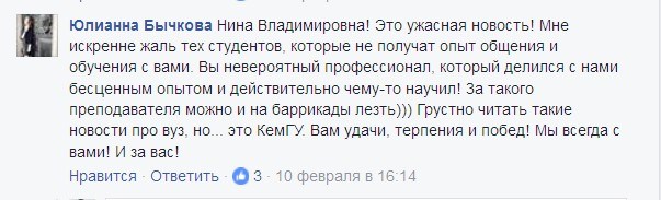 Фото: Уволенного педагога поддерживают студенты. Автор: со страницы Нины Обелюнас в facebook.com После проректор по УВР Мария Леухова вызывала студентов к себе. Что происходило на встрече, Обелюнас знает со слов студентов: «Их подводили к мысли о том, что это я виновата в запахе: не перевела студентов в другую аудиторию, да еще и заставила написать заявление (или вообще его сама написала). Хотя я не понимаю, почему руководство вуза не организовала перенос пар, раз оно было в курсе, что у них будет проходить ремонт. Детям сказали, что всем виновным лицам вынесут предупреждение, а для Нины Владимировны, если будет применять к студентам репрессивные меры, найдется статья, по которой ее можно уволить».