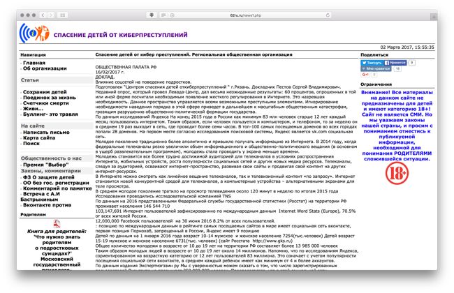 Скриншот сайта «Спасение детей от киберпреступлений»