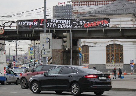 Баннер "Путин - это война" на Комсомольской площади в Москве, 05.03.2017. Фото: styazshkin.livejournal.com
