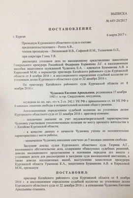 23 февраля Генпрокуратура внесла в Верховный суд представление, в котором потребовала отменить приговор и прекратить уголовное дело в связи с отсутствием состава преступления. 28 февраля Верховный суд обязал президиум Курганского областного суда пересмотреть дело.