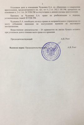 В ноябре 2016 года Катайский районный суд приговорил Евгению Чудновец к шести месяцам лишения свободы за распространение детской порнографии (ч. 2 ст. 242.1 УК). Позже срок был уменьшен до пяти месяцев.