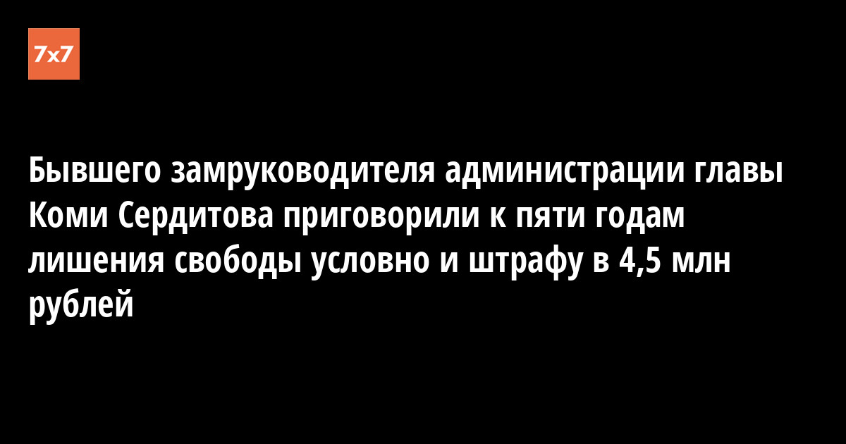 Сыктывкарский городской суд 6 марта приговорил бывшего заместителя руководителя администрации главы Коми Александра Сердитова к пяти годам лишения свободы условно, штрафу в 4,5 млн руб. и запрету занимать должности на госслужбе в течение трех лет за злоупотребления, растраты, незаконное предпринимательство и дачу взятки. Его родственник, бывший директор Сыктывкарского ликероводочного завода (СЛВЗ) Владимир Тяпкин, также приговорен к лишению свободы условно на пять лет с запретом занимать должности в госорганизациях, коммерческих и некоммерческих структурах в течение трех лет и штрафу в 1 млн 100 тыс. руб., передает корреспондент «7x7» из зала суда.