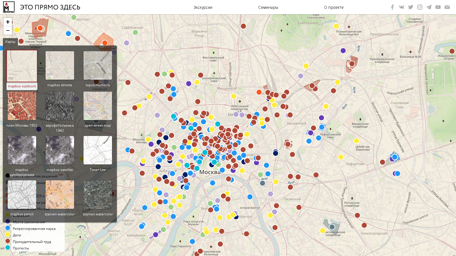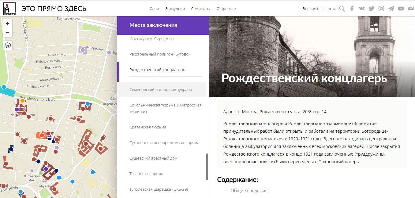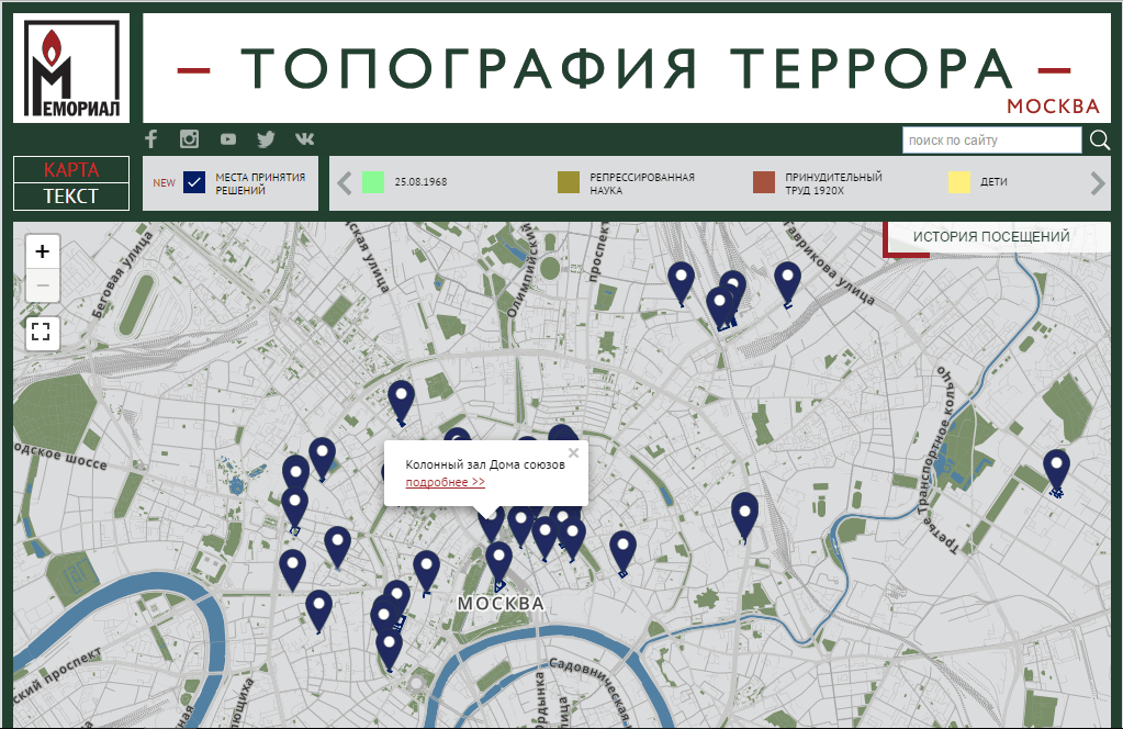 Проект Международного «Мемориала» в Москве «Топография террора» помогает жителям изучить ту часть истории своей страны, которую принято замалчивать. Он представлен в виде интерактивной карты столицы, на которой обозначены места советских репрессий.