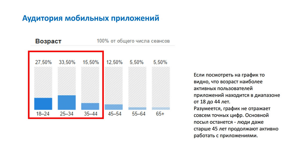 - Возраст наиболее активных пользователей приложений находится в диапазоне от 18 до 44 лет.
