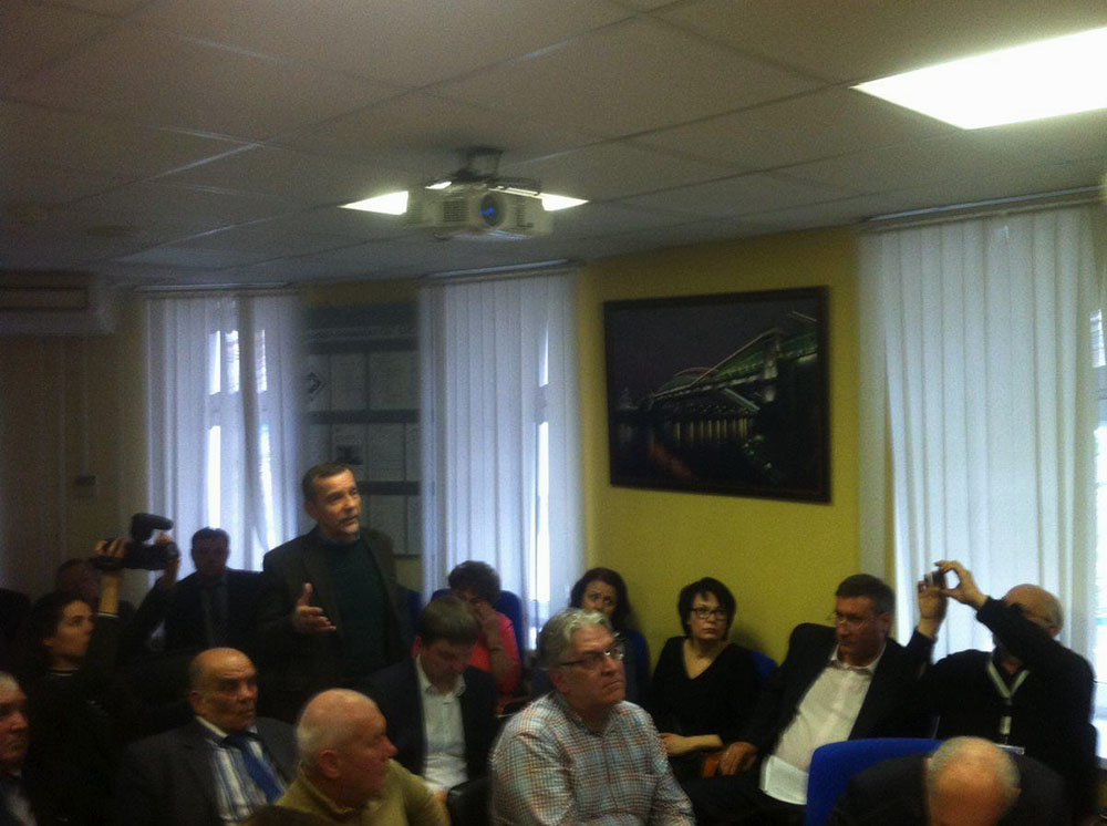 В зале, помимо активистов, которые постоянно дежурят у мемориала, были также участники прокремлевского движения «Serb», пытавшиеся провоцировать остальных участников обсуждения, в том числе и исполнительного директора движения «За права человека» Льва Пономорева, призвавшего внести в лист предложений просьбу об установке мемориала. Кто-то кричал, что люди все равно будут нести цветы, даже если будет идти ремонт.
