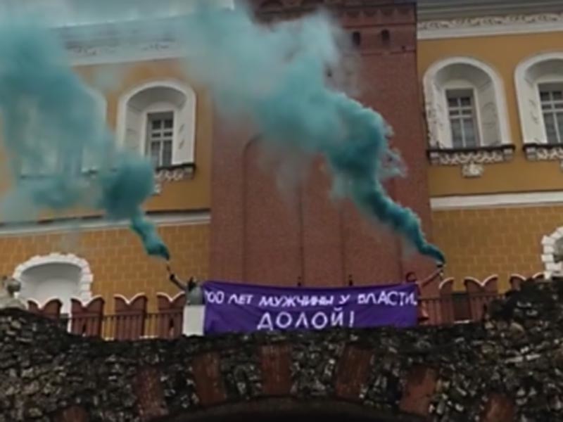 Что касается акции в столице, то на ней задержали не менее трех человек, которые повесили у стен Кремля со стороны Александровского сада баннер с надписью "200 лет мужчины у власти. Долой!" Об этом сообщает сайт "ОВД-Инфо" со ссылкой на активистку Елену Безрукову. Видео акции опубликовано в Facebook-аккаунте художницы Екатерины Ненашевой.