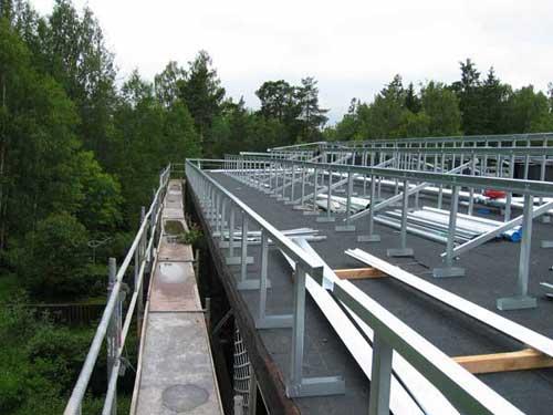 Хорошей альтернативой этому может стать решение по трансформации плоской крыши в скатную с использованием стропильных систем из холоднокатаных оцинкованных металлических профилей. Это на долгие годы позволит решить проблемы ремонта, а значит, один раз потратив средства на новую кровлю, заказчик существенно экономит в процессе ее эксплуатации.