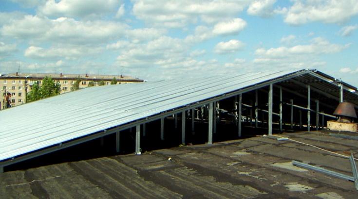 Технология преобразования мягкой крыши в скатную предельно проста. В качестве стропильной системы используются холоднокатаные оцинкованные профили, которые монтируются прямо на существующую, старую плоскую кровлю, затем на них крепится кровельный материал.
