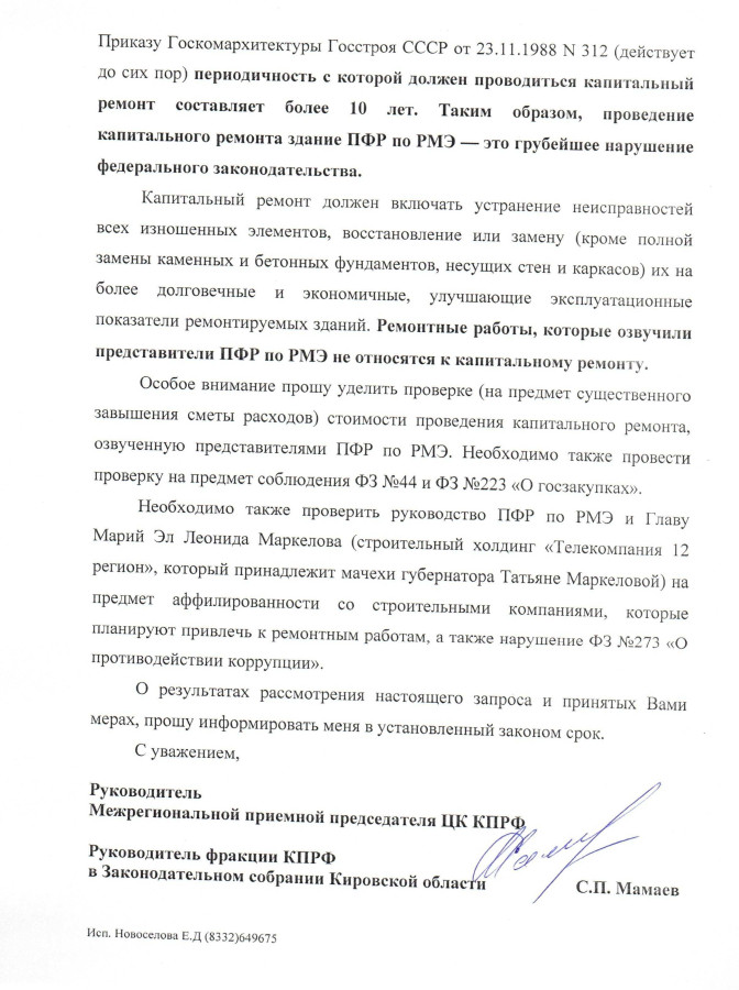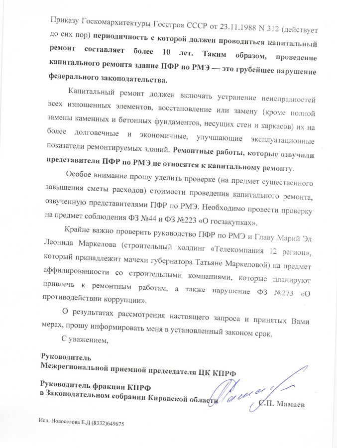 Особое внимание депутат Сергей Мамаев просит уделить проверке (на предмет существенного завышения сметы расходов) стоимости проведения капитального ремонта, озвученную представителями ПФР по РМЭ. Необходимо также провести проверку на предмет соблюдения ФЗ №44 и ФЗ №223 «О госзакупках».