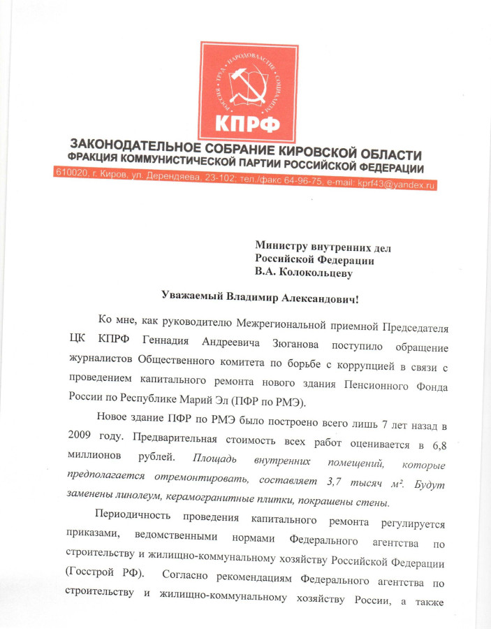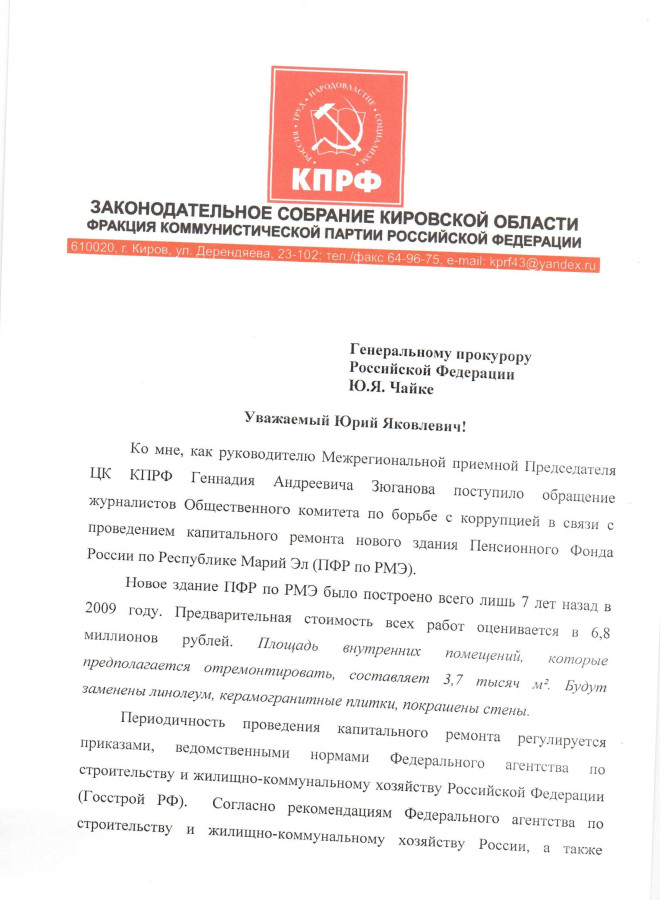 Журналисты и эксперты Общественного комитета по борьбе с коррупцией в Марий Эл обратились за помощью к Сергею Мамаеву (депутату и руководителю Межрегиональной приемной Председателя ЦК КПРФ Геннадия Андреевича Зюганова) в связи с необоснованным проведением капитального ремонта нового здания Пенсионного Фонда России по Республике Марий Эл (ПФР по РМЭ).