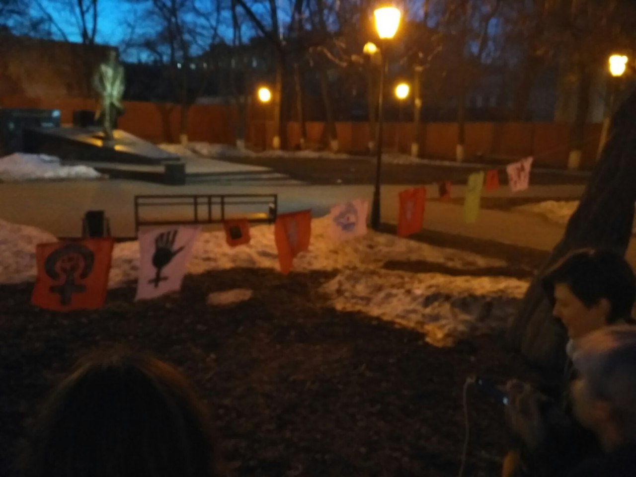 По завершении встречи участники и участницы собрали свои поделки, напоминающие разноцветные платочки, и размахивая ими дошли до памятника Платонову на проспекте Революции. Там, натянув нитку между деревьями, они украсили лоскутками с феминистскими эмблемами город.
