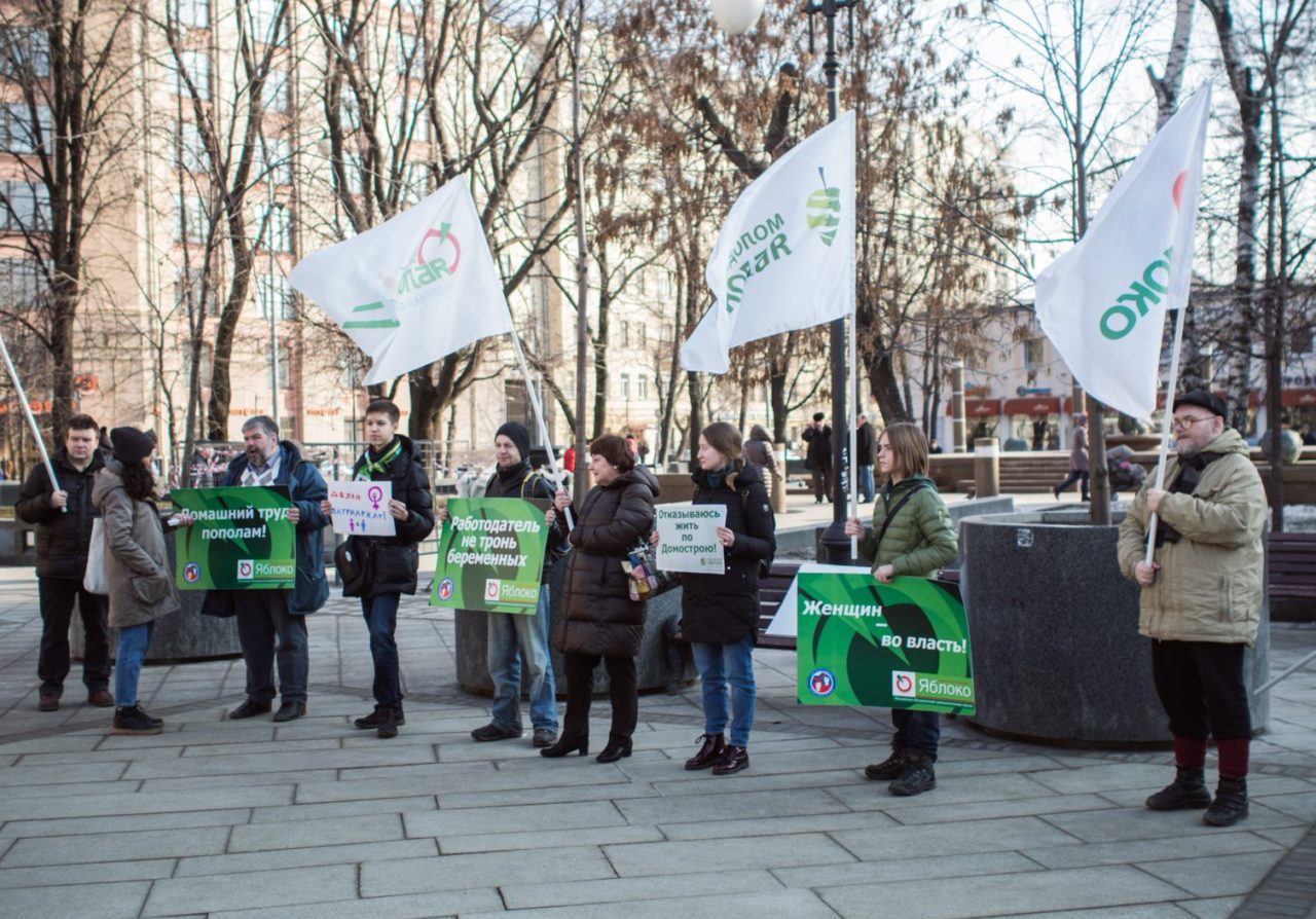 Пикет партии «Яблоко».Фото: Павел Поборуев Председатель гендерной фракции «Яблока» Галина Михалева напоминает о современных проблемах женщин. «Мы очень далеки от цели ООН к 2030 году — гендерного равенства, более того, у нас сегодня наблюдается консервативный тренд. Разница в зарплате женщин и мужчин за равный труд составляет 30%, РПЦ лоббирует запрет на аборты, 456 профессий остаются запрещенными для женщин, принят закон о декриминализации домашнего насилия, не соблюдается европейская норма «один кризисный центр на 100 тысяч населения» — у нас есть города, где центров вообще нет».