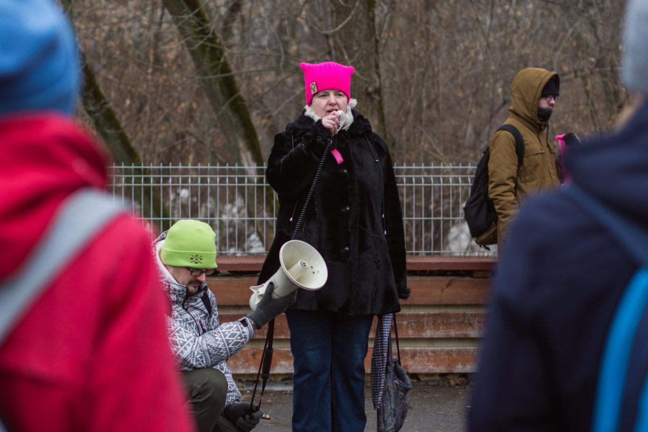 На политике и феминистке Татьяне Сухаревой черный полушубок и ярко-розовая шапка с кошачьими ушками и брошью с символом Венеры. «Подлинник, прямиком из Британии», — гордо заявляет одна из организаторок (феминистки предпочитают все профессии называть в женском роде). Этот головной убор носила британская феминистка, вышедшая на митинг против Трампа в Лондоне. Организаторы попросили будущих участников митинга выдержать дресс-код: «связать или приобрести розовые шапки, надеть хотя бы какую-то деталь розового цвета». Розовый, по их замыслу, должен стать символом «протеста против патриархальной иерархии и власти».