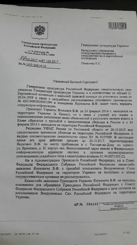 "Заявление Януковича В.Ф. не поступало и этими органами не рассматривалось", - говорится в опубликованных Луценко сканах ответа российской Генпрокуратуры.