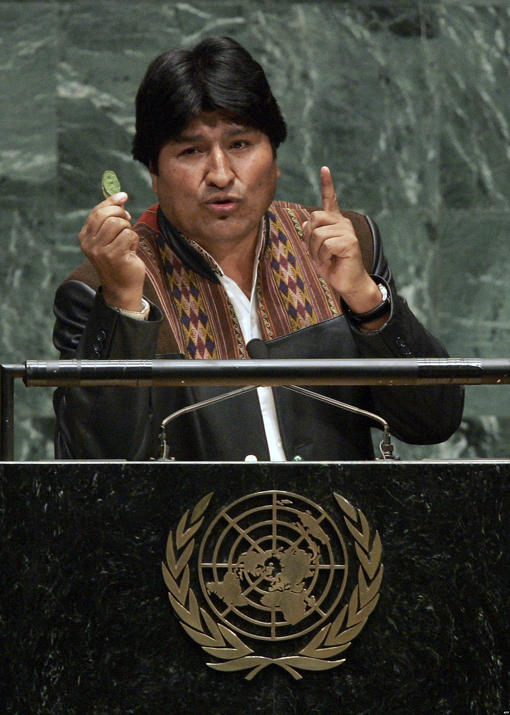 На звучащие со всех сторон обвинения в том, что Боливия остается крупнейшим в мире поставщиком сырья для производства кокаина, который в основном вырабатывается в принадлежащих преступным картелям подпольных лабораториях в Колумбии и Мексике, он не реагирует, продолжая напоминать всему миру, что кока, которую он называет "культурным достоянием нации", и кокаин – не одно и то же.