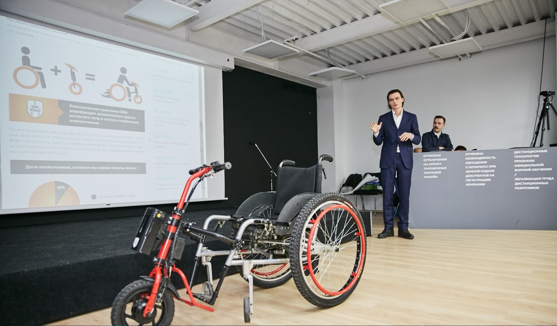 Фаворитом экспертов стал проект социальной направленности – электрическая приставка к инвалидным коляскам UNA. Она представляет собой съемную конструкцию, в которой есть мотор-колесо с электрическим двигателем, руль и батарейка. Конструкция крепится к коляске спереди и позволяет ей развивать скорость до 15 км/ч.