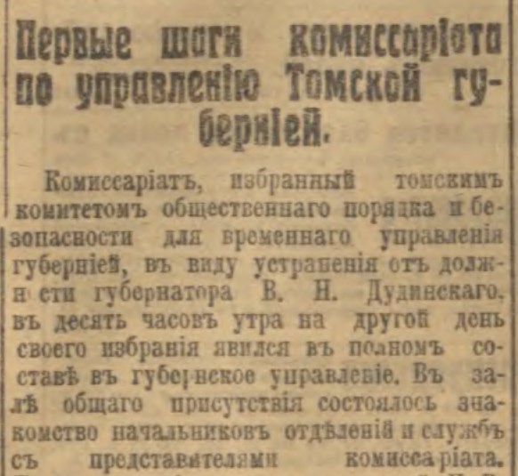 Городской комитет, идя навстречу желаниям томского губернатора Дудинского, признал необходимость устранить его от управления губернией".