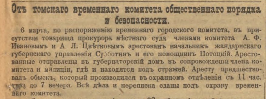 В Томске обошлось без насилия и массовых расправ над полицейскими. Однако отдельные аресты все же случались. 6 марта были взяты под стражу начальник губернского жандармского управления Субботин и его помощник Потоцкий. В тот же день в охранном отделении провели обыск, после которого все дела и служебная переписка были изъяты и поступили под ответственность временного городского комитета. Любопытно, сохранились ли те документы и где сейчас они могут находиться?