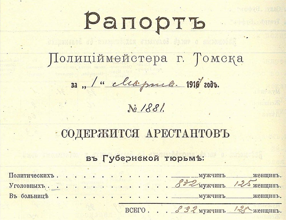 Одним из первых актов Временного правительства стал указ об амнистии для политических заключенных. Из Нарымской ссылки освободились те, кто был осужден при царском режиме. Из томских тюрем вышли участники запрещенных политических партий и движений. Сколько их было всего? Точные цифры назвать трудно. В Государственном архиве Томской области есть документ о численности уголовных преступников в губернской тюрьме на 1 марта 1917 года. В графе «политические» данные отсутствуют, по арестантским отделениям сведений нет.