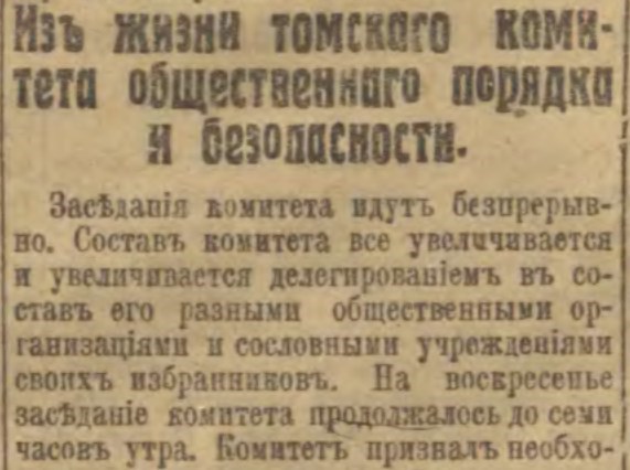 Несмотря на роспуск полиции, в Томске взаимодействие между новой властью и "силовиками" продолжалось. Уездный исправник И.И.Загарин подтвердил в рапорте, что "вверенные ему чины словом и делом докажут готовность служить новому строю". Для членов временного комитета общественного порядка исправник сделал доклад (увлекательный по форме и информативный по содержанию) о настроениях в деревнях.