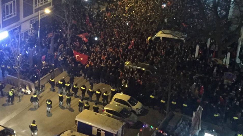 Несмотря на это, представители турецкой диаспоры в Роттердаме все же вышли в субботу и устроили митинг у турецкого консульства, выражая свое недовольство. Сначала было около двух тысяч человек, и полиция оттеснила их от здания консульства. Но после того, как распространилась новость, что местная полиция не пустила Фатму Бетюль Сайян Кайю в Роттердам, выступления стали активнее, начались стычки с полицейскими. К утру ситуация стабилизировалась, но на улицах города еще долго дежурили полицейские. По информации AP, были арестованы 12 человек, а пострадали в результате столкновений 7 человек.