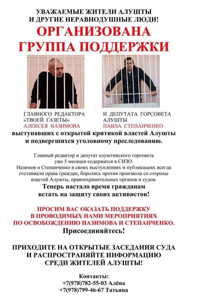 Пока обвиняемые находятся в СИЗО, в Алуште активисты организовались в группу поддержки: ходят на заседания судов и распространяют информацию о деле. Недавно они создали сайт, посвященный судебному процессу над Назимовым и Степанченко, где публикуют хронику судебного процесса, сообщения и документы.