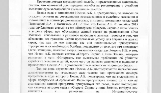 Защита блогера Антона Носика, приговоренного к штрафу в 300 тысяч рублей за публикацию «Стереть Сирию с лица земли», пожаловалась в Верховный суд и в Европейский суд по правам человека в Страсбурге. Об этом 14 марта Носик написал в своем блоге.