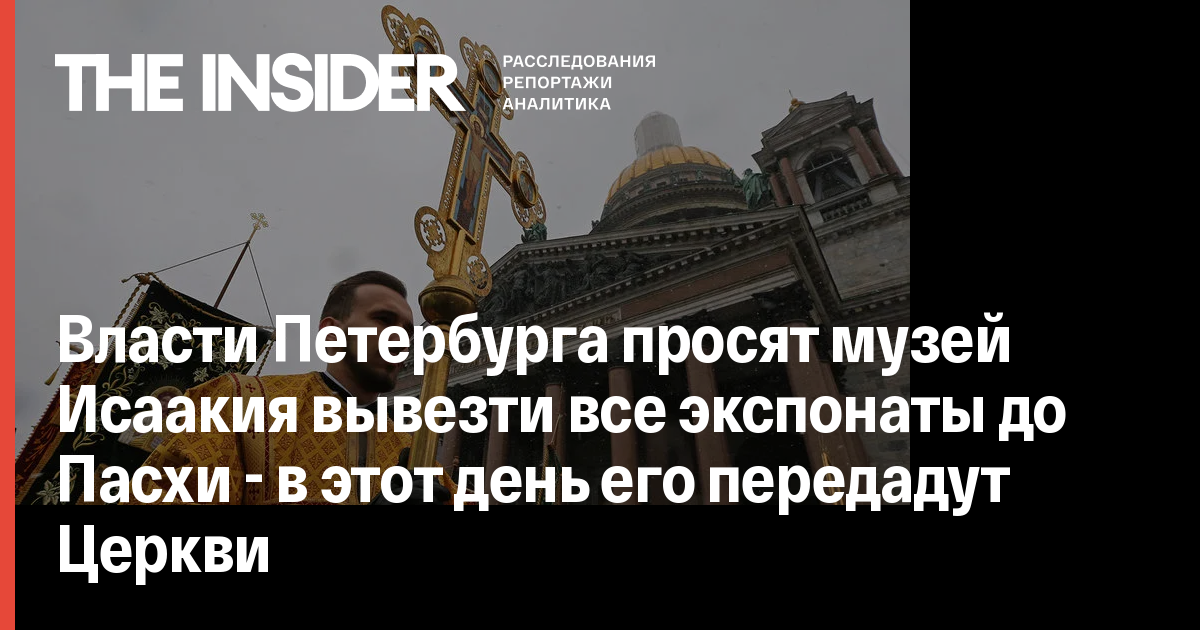 Власти Санкт-Петербурга попросили музей Исаакиевского собора вывезти все экспонаты до Пасхи, то есть до 16 апреля. К этому празднику руководство города хочет приурочить передачу собора РПЦ, сообщает РБК со ссылкой на источники в Минкульте и федеральных чиновников.