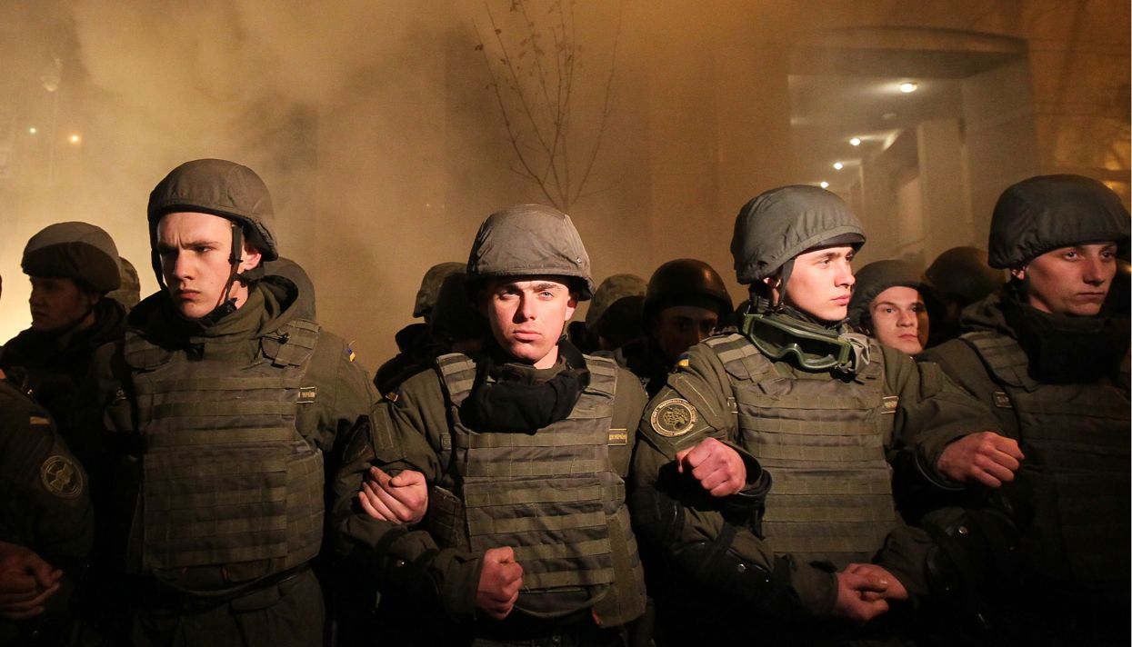 Фото: Петр Сивков / ТАСС / Scanpix / LETA Сотрудники правоохранительных органов Украины на Крещатике во время нападения националистов на отделение Альфа-банка в Киеве, 15 марта 2017 года