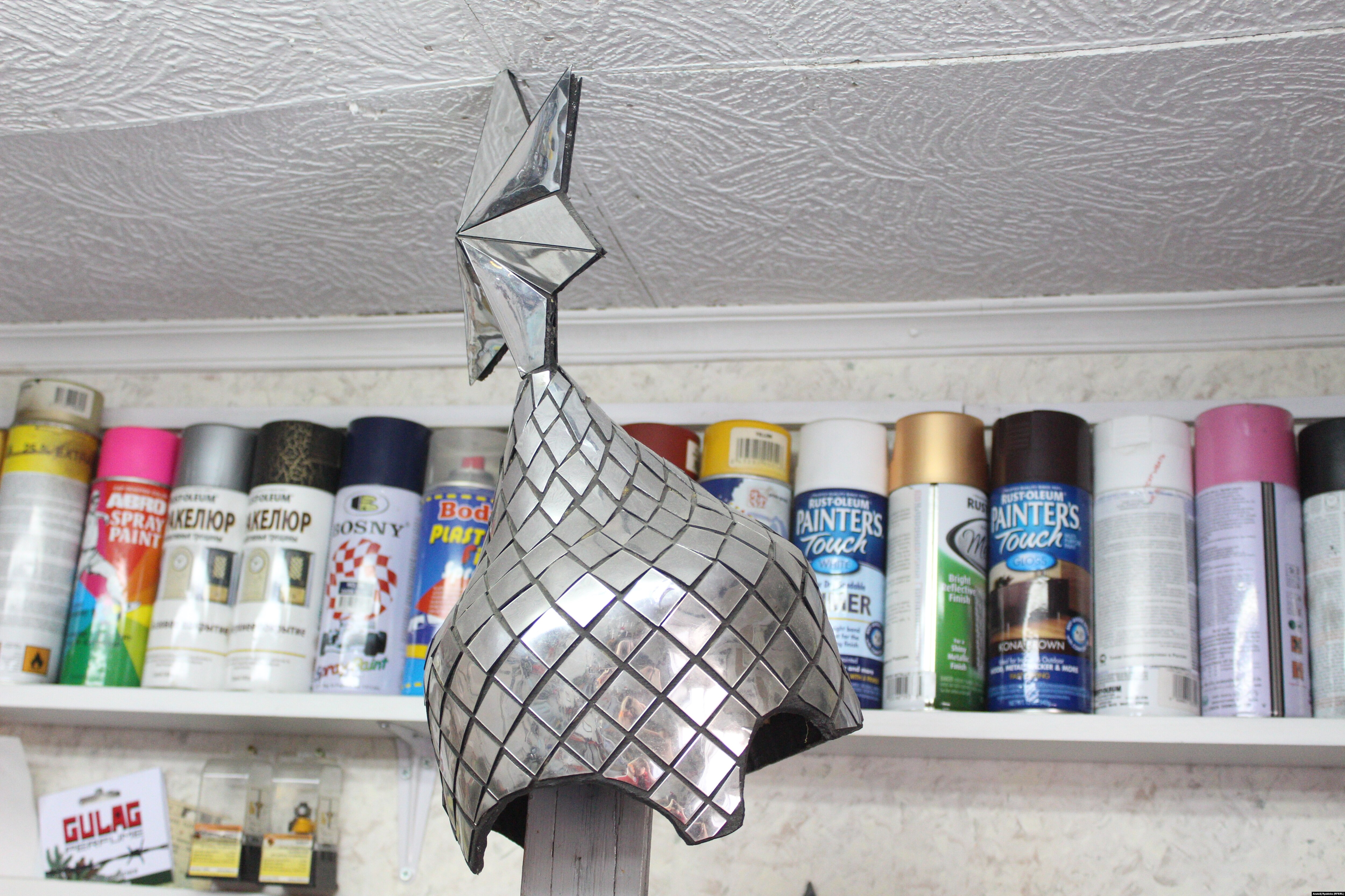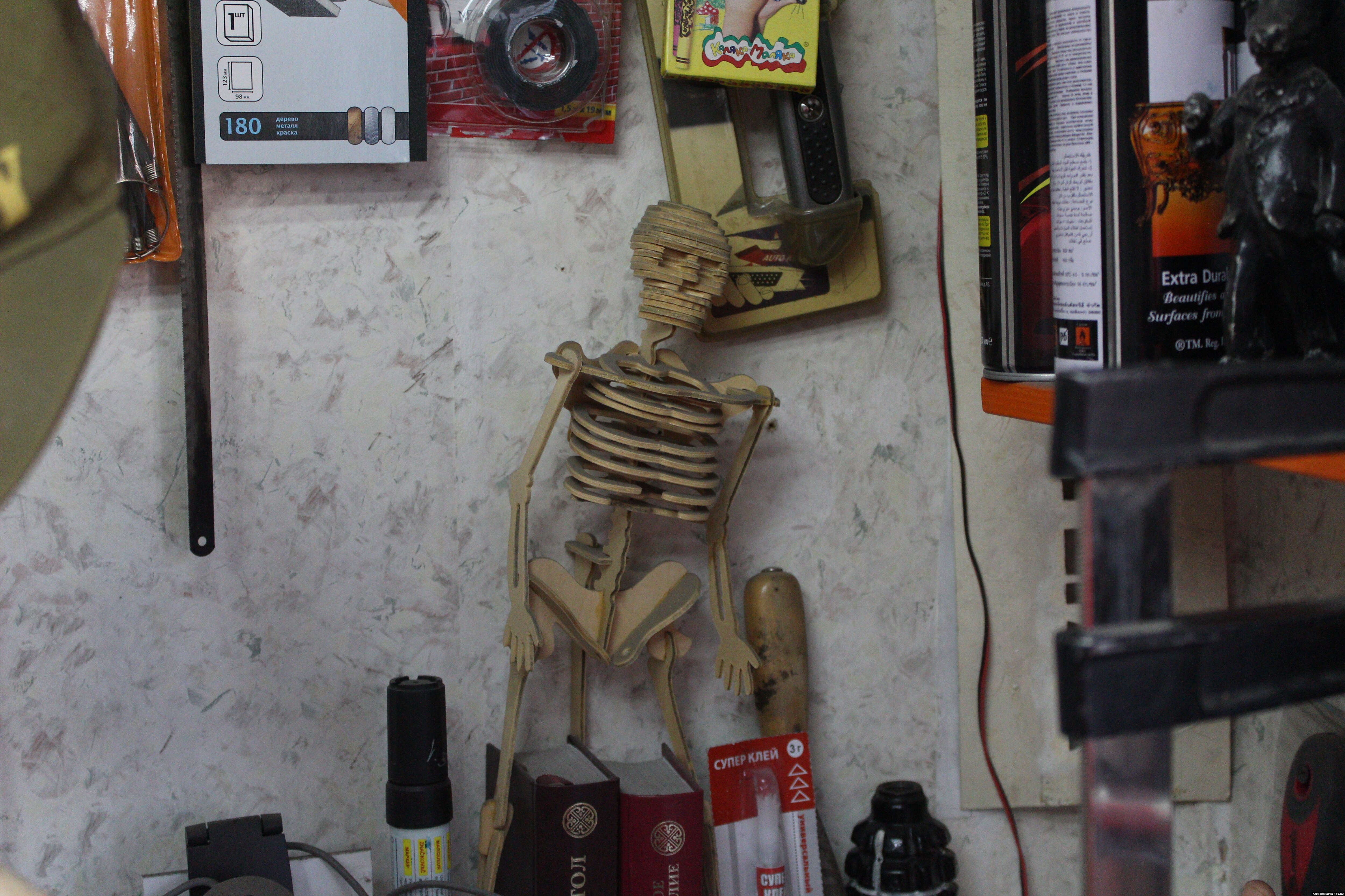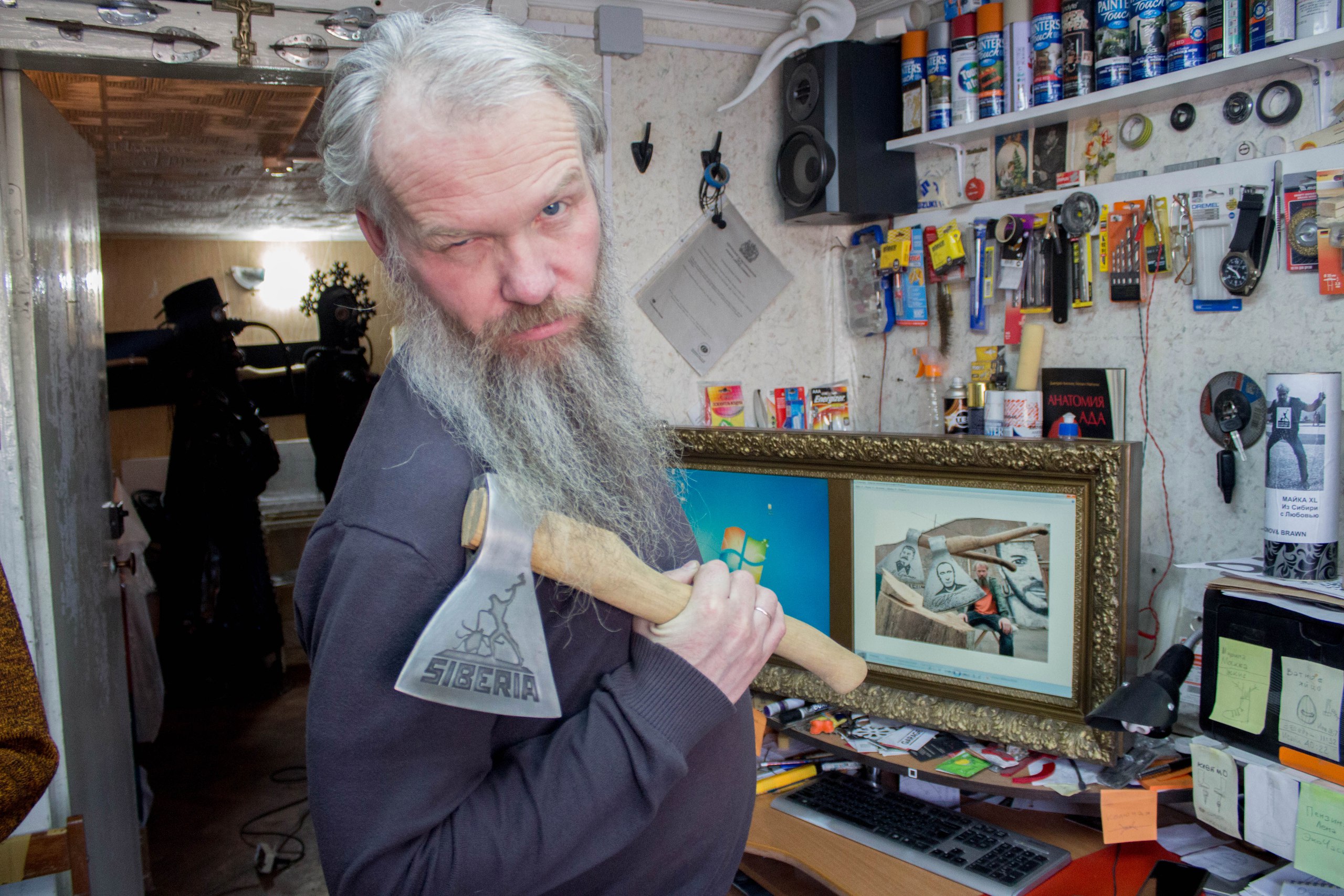 "Здесь куда ни плюнь, в произведение искусства попадешь", – замечает художник Василий Слонов, показывая свою мастерскую. Произведения искусства тут и правда везде. По стенам, в ящиках письменного стола и под столом, в коридоре. Балалайка-кокошник и сковородка-кокошник, вертикальные коньки и скафандр для водолаза с канделябрами по бокам – "чтобы, значит, свет нес в самые глубины". И топор – "как зеркало русской истории".