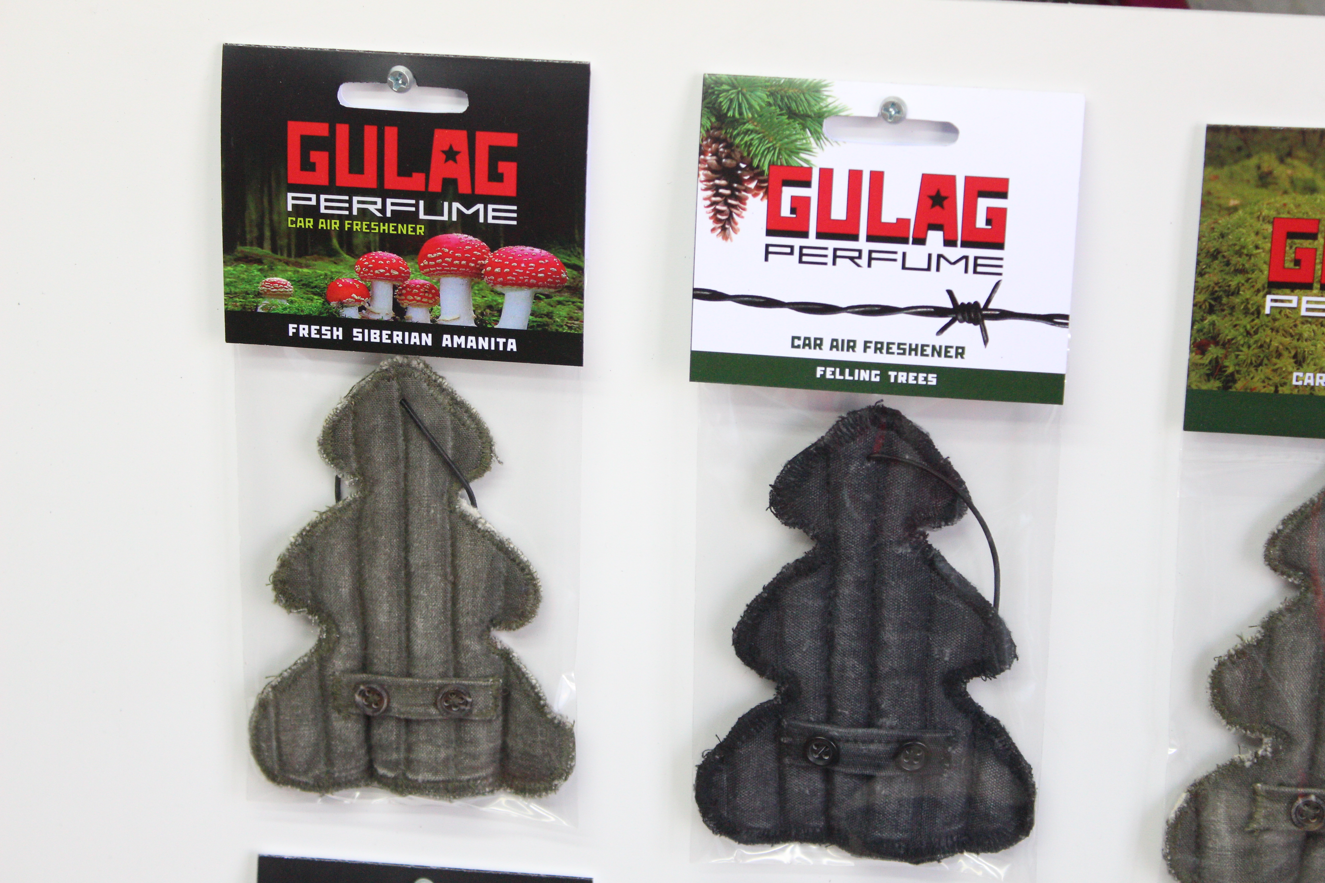 Это экспонаты прошлых выставок художника. Василий Слонов известен нашумевшими арт-поектами: Welcome! Sochi 2014 и "Ватники Апокалипсиса". Его обвиняли в русофобии, его выставки закрывали, его работами "интересовались" компетентные органы. А недавно Слонов представил свой новый арт-проект – "ГУЛАГ-парфюм". Начал с автомобильных освежителей воздуха, в числе которых, например, "Аромат лесоповала", "Запах свежих сибирских мухоморов", "Аромат выстрела", "Мох", "Аромат ружейного пороха" и "Благоухание свежей могилы". Эта работа, посвященная столетию Октябрьской революции, будет частью большой серии. Художник планирует закончить ее к осени. Новый арт-проект – попытка осмыслить такое явление, как ГУЛАГ, который, по выражению Василия Слонова, "у нас повсюду" и синдром которого не изжит в России до сих пор. Новая серия "ГУЛАГ-парфюм" уже вызвала неоднозначную реакцию.
