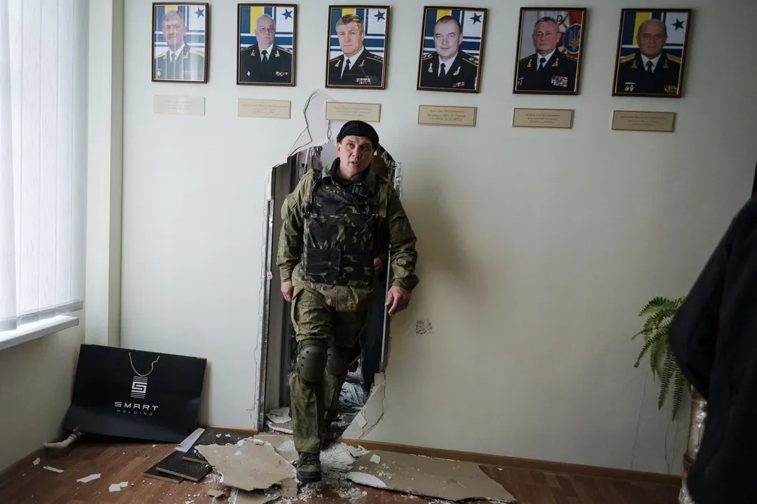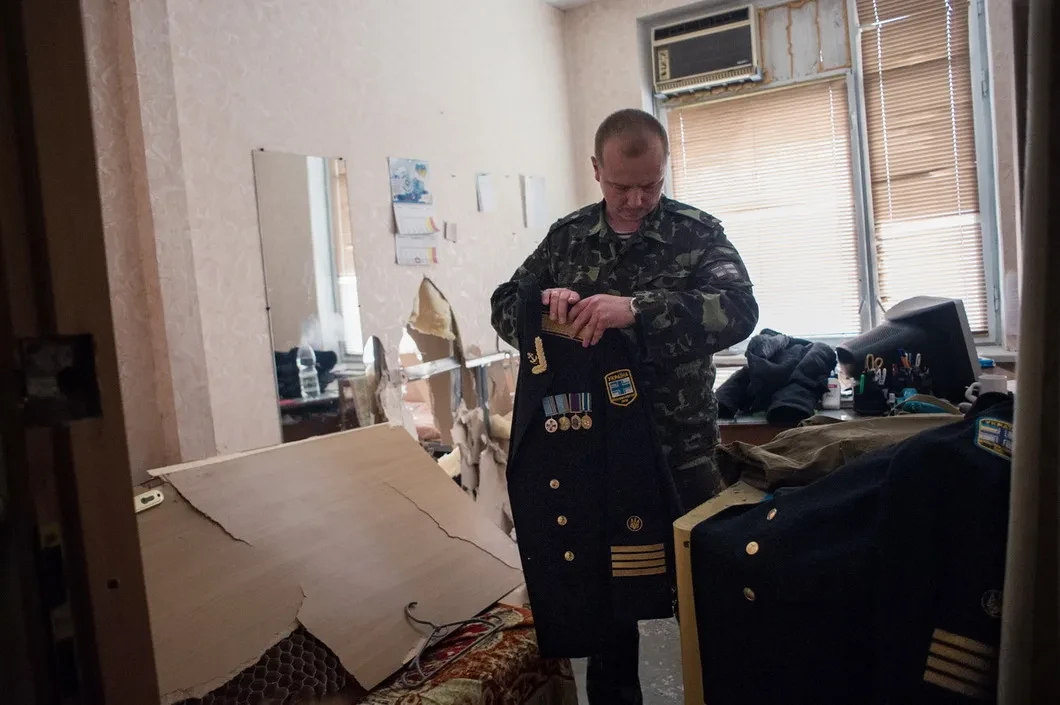 Офицер военно-морских сил Украины собирает свои личные вещи в захваченном штабе. 19 марта 2014 года.
