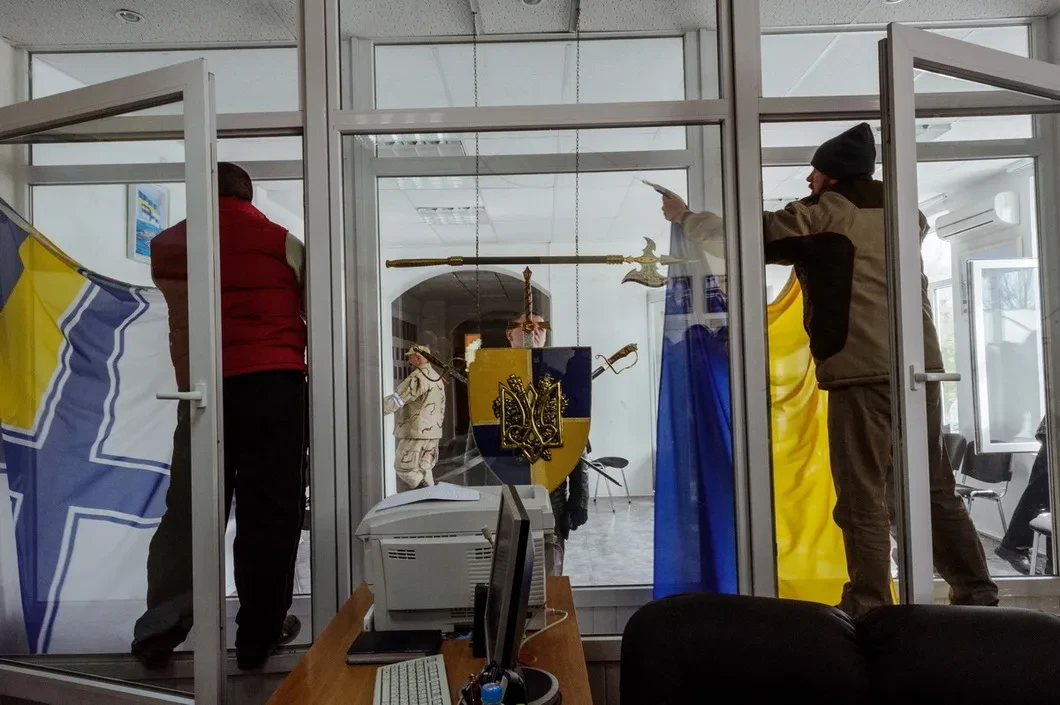 Участники захвата штаба военно-морских сил Украины в Севастополе снимают государственную символику в одном из кабинетов штаба. 19 марта 2014 года.