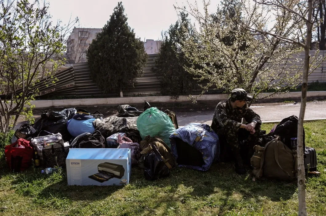 Украинский военный сидит на своих вещах возле военной базы «Бельбек», в ожидании грузовика, чтобы покинуть территорию Крыма.
