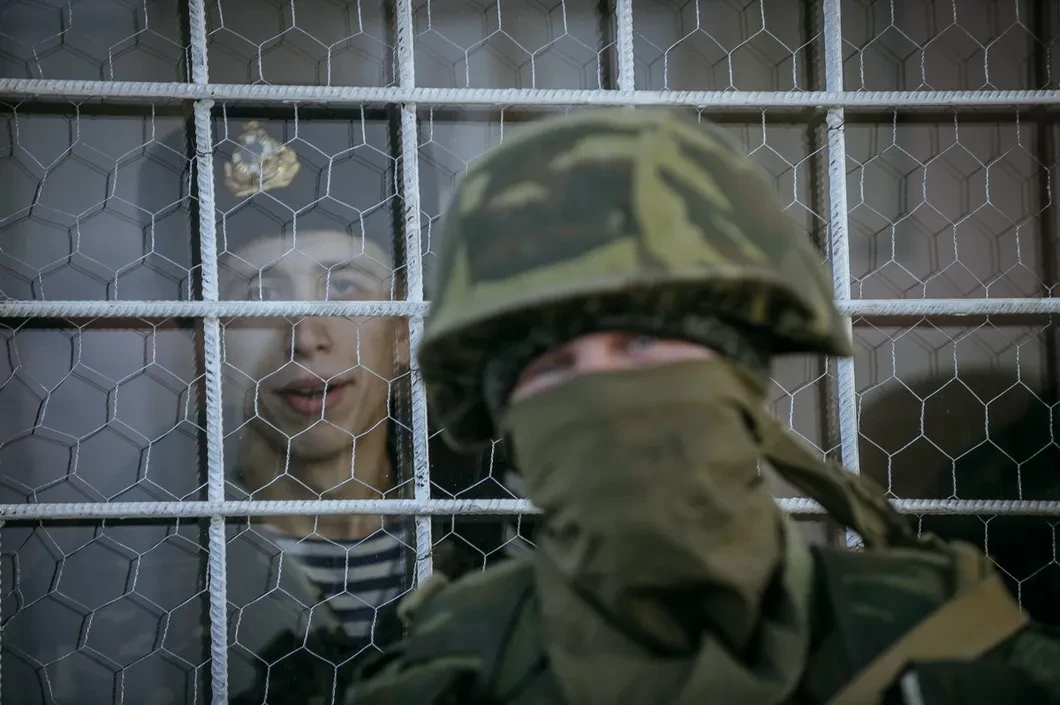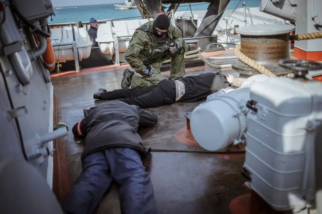 Моряки ВСУ лежат лицом вниз на палубе корвета «Хмельницкий» во время захвата судна севастопольскими народными дружинниками.