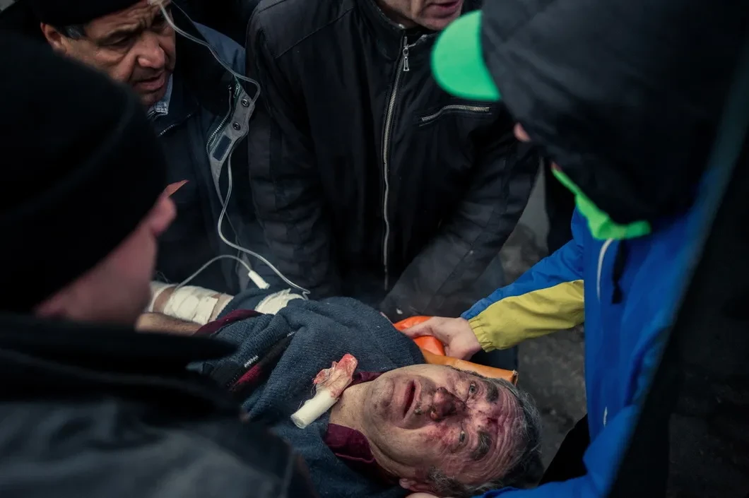 Люди несут тяжело раненного мужчину, пострадавшего во время столкновений у здания Верховного совета Крыма. 26 февраля 2014 года, Симферополь.