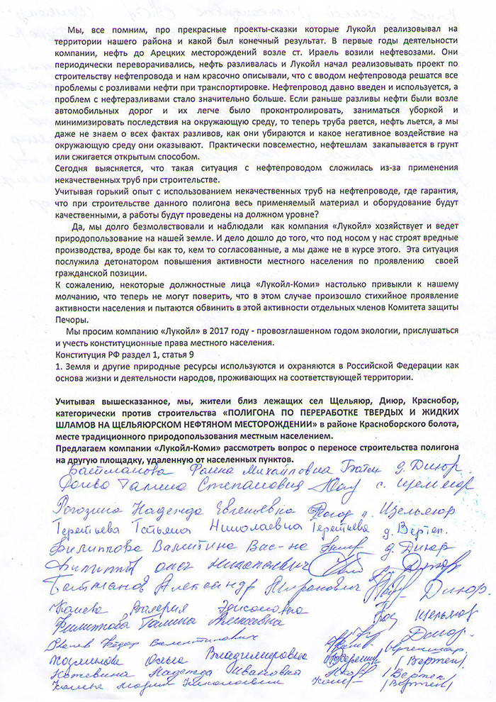 За сутки петицию подписали более ста человек. Автор документа — один из жителей Щельяюра Владимир Рочев. Он призывает остановить строительство полигона по переработке нефтешлама. «Данный объект находится всего в полутора километрах от наших населенных пунктов д. Диюр и в двух километрах от п. Щельяюр и с. Краснобор. Такое близкое соседство с данным объектом угрожает стать экологической катастрофой для окружающей среды и нас — жителей близлежащих поселений, а это более шести тысяч человек», — говорится в сопровождающем тексте.
