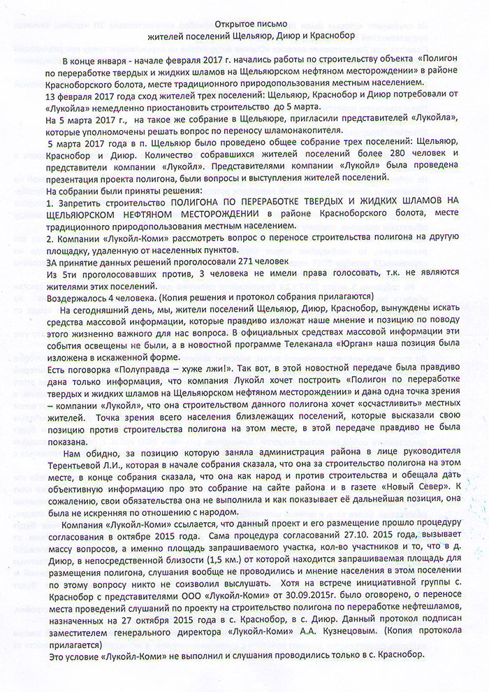 Петиция против строительства шламонакопителя рядом с поселком Щельяюр, деревней Диюр и селом Краснобор в Ижемском районе опубликована на сайте change.org 15 марта. Борьба против строительства продолжается несмотря на то, что представители правительства и компании «Лукойл» в начале марта встретились с местными жителями и попытались убедить их в безопасности и экологичности нового объекта.