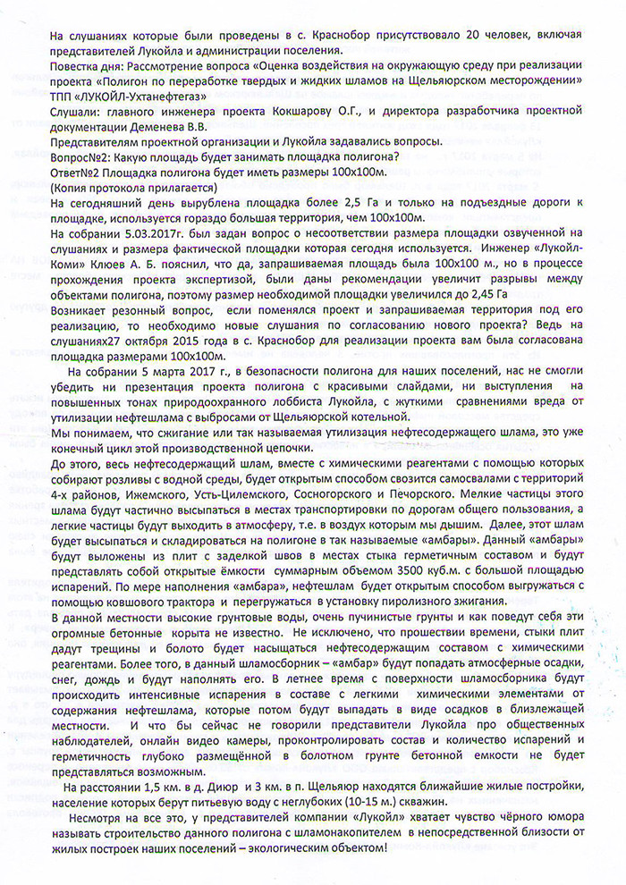 «...так называемая утилизация нефтесодержащего шлама — это уже конечный цикл производственной цепочки. До этого весь нефтесодержащий шлам вместе с химическими реагентами... будет открытым способом свозиться самосвалами с территорий 4-х районов: Ижемского, Усть-Цилемского, Сосногорского и Печорского. Мелкие частицы этого шлама будут частично высыпаться в местах транспортировки по дорогам общего пользования, а легкие частицы будут выходить в атмосферу... Далее этот шлам будет высыпаться и складироваться на полигоне в так называемые „амбары“. Данные „амбары“ будут выложены из плит с заделкой швов в местах стыка герметичным составом и будут представлять собой открытые емкости суммарным объемом 3 500 куб.м. с большой площадью испарений. По мере наполнения „амбара“, нефтешлам будет открытым способом выгружаться с помощью ковшового трактора и перегружаться в установку пиролизного сжигания. В данной местности высокие грунтовые воды, очень пучинистые грунты, и как поведут себя эти огромные бетонные корыта не известно. Не исключено, что по прошествии времени стыки плит дадут трещины и болото будет насыщаться нефтесодержащим составом с химическими реагентами».