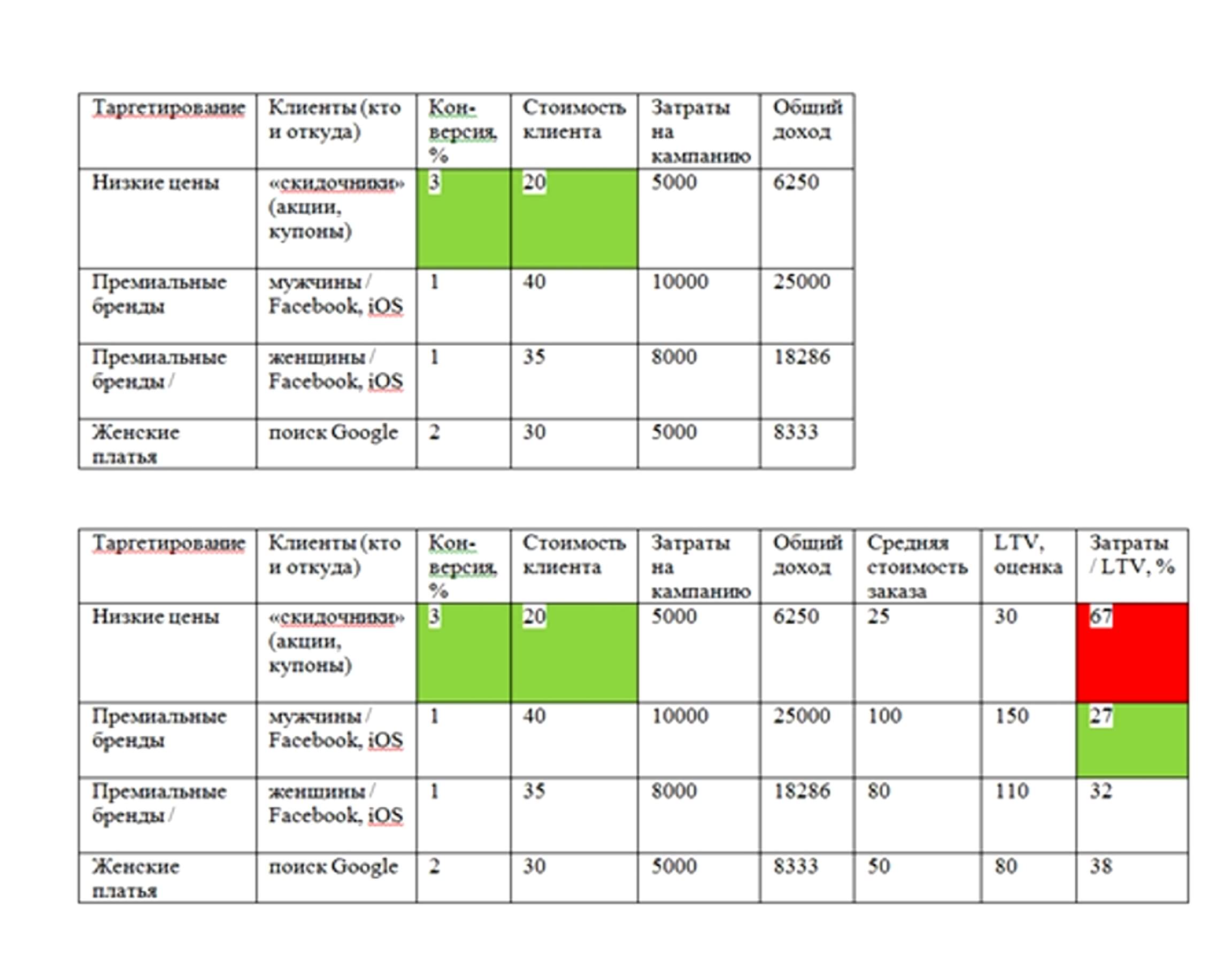 По ее первой (верхней) части самая успешная в финансовом отношении кампания с конверсией в 3% и стоимостью привлечения одного клиента в 20 долларов. Казалось бы, почему бы не вложить в нее дополнительные средства? Но когда мы берем в расчет стоимость заказа, доходность и LTV (нижняя часть таблицы), картина полностью меняется. Мы видим, что с учетом всех данных наилучшие результаты показывает кампания, нацеленная на мужчин с iOS.