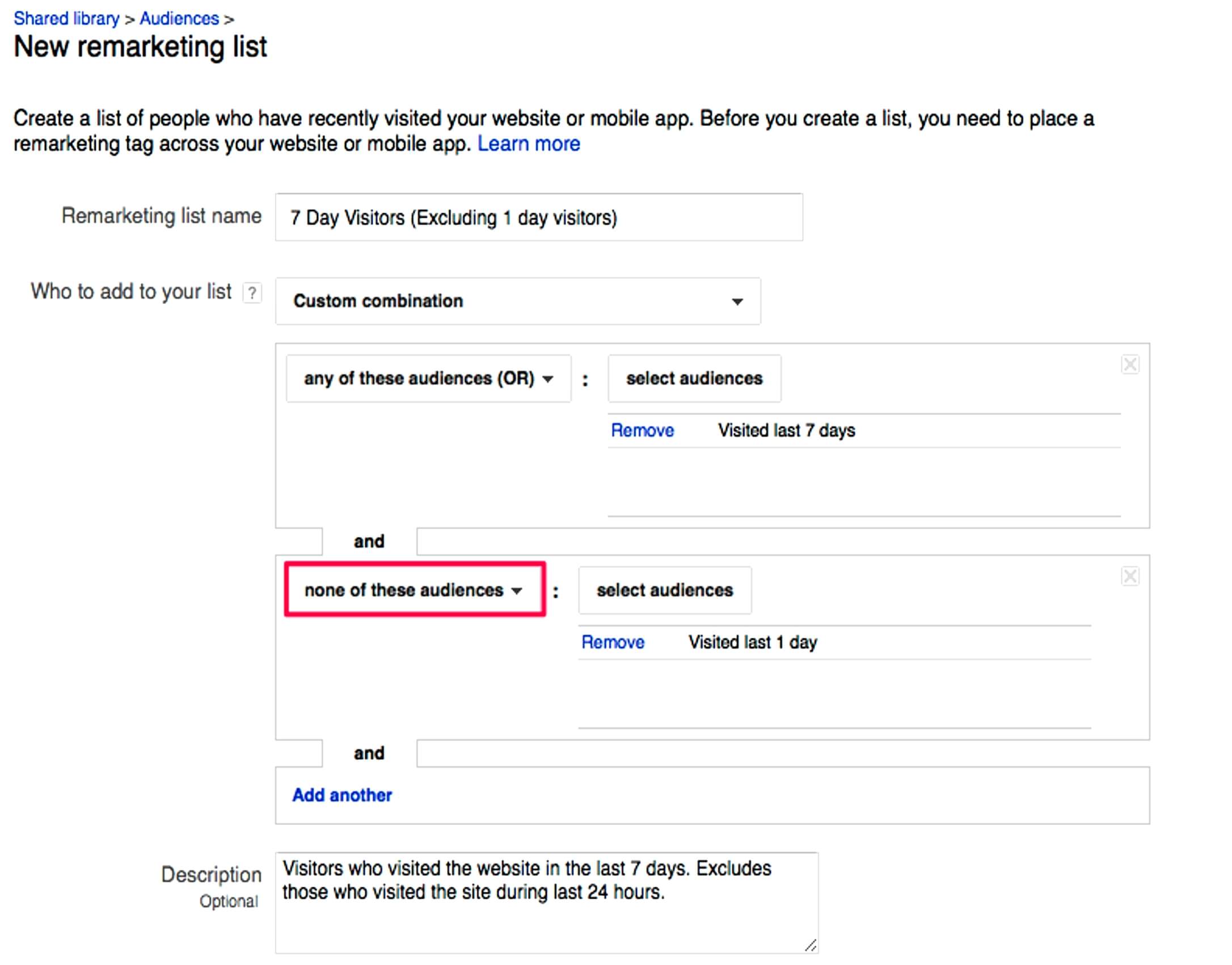 Не забывайте о сегментации «по времени». Обычно отдача от тех, кто недавно заходил на сайт, больше, чем от тех, кто был на нем неделю или месяц назад. При формировании деления «по времени» не забывайте исключать более «раннюю» категорию. Например, из «трехдневного списка» нужно исключить тех, кто в «24-часовом списке». Таким образом, эти две аудитории не будут «перехлестываться», и им не будет приходить одинаковых предложений. Вы можете установить «исключающие правила» в Google AdWords с помощью списков Custom Combination.