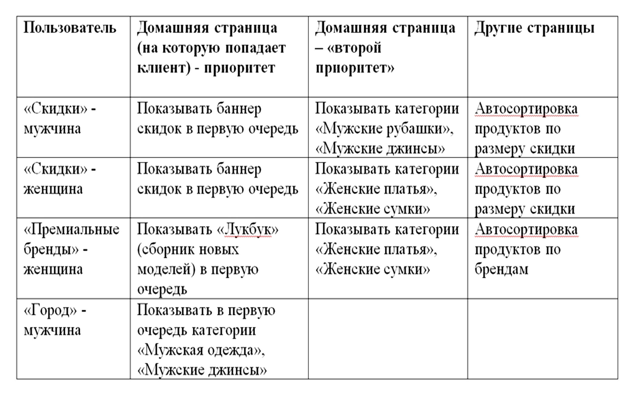 - автоматическое «внедрение» динамичного (изменяющегося) контента по всему сайту в зависимости от посетителя. Например, показывать разделы «в тренде» и «лукбук» тем, кто пришел после кампаний о новинках модной индустрии.
