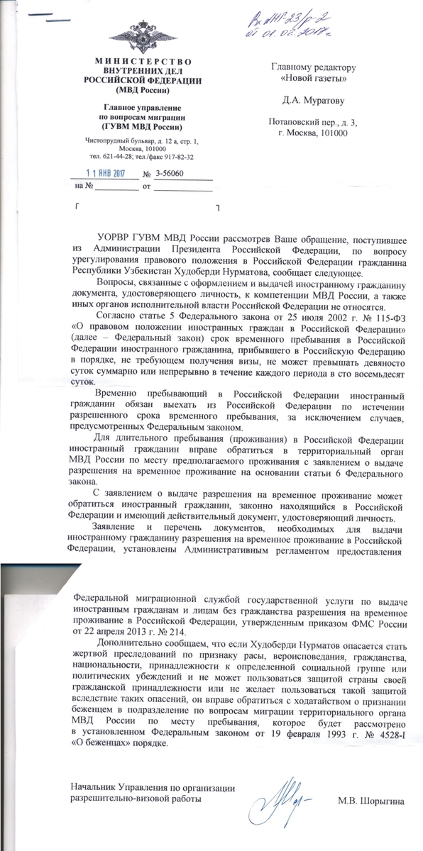 В январе 2017 года в МВД ответили, что получили перенаправленное из администрации президента обращение главного редактора «Новой газеты» Дмитрия Муратова по поводу предоставления «легального статуса» журналисту.