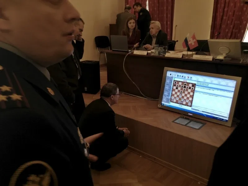 Вот и посол. Его зовут Ив Россье, он в черной паре и желтом галстуке. Стороны приветствуют друг друга по скайпу. Анатолий Карпов напоминает регламент: шесть пар соперников играют две партии, время партии ограничено 15 минутами.